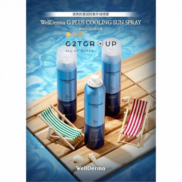 - Xịt chống nắng Wellderma G Plus Cooling Sun Spray chứa thành phần Nhân sâm chiết xuất, Dịch lọc lên men tự nhiên Galactomyces: cung cấp độ ẩm và mang lại sự đàn hồi cho làn da mệt mỏi, giúp da sáng và trong suốt.